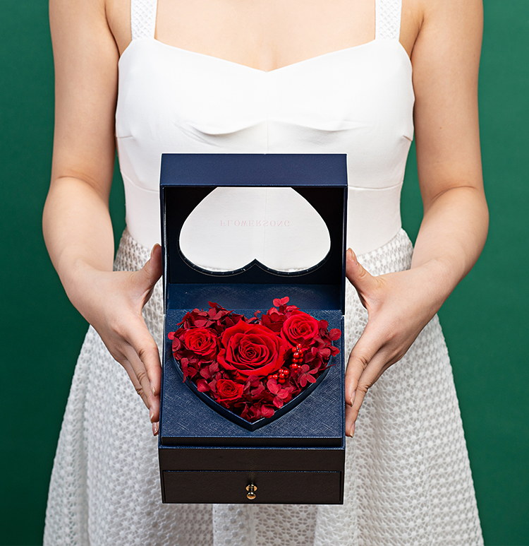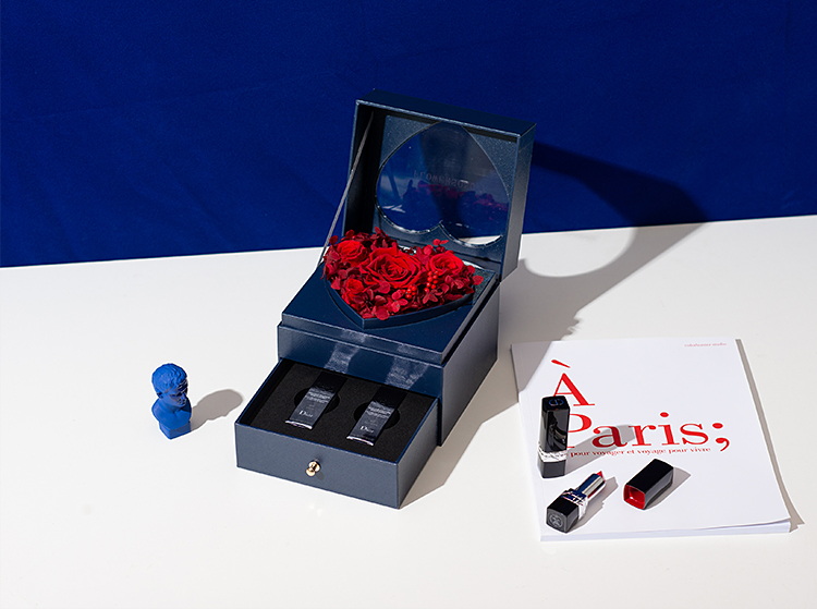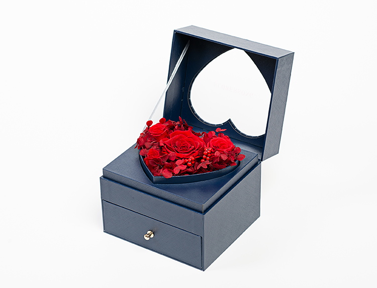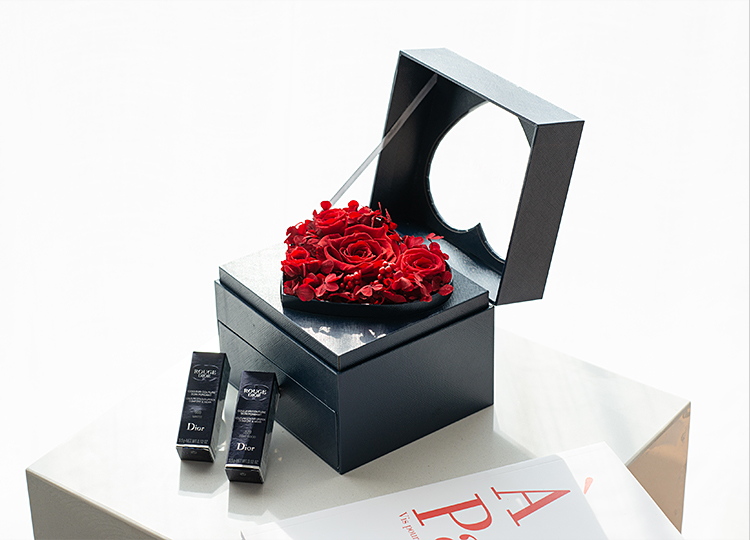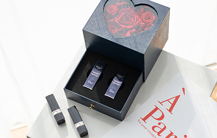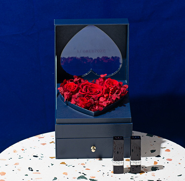 立减8元厄瓜多尔进口永生红玫1朵(直径6-7CM) 、红色小玫瑰3朵、红色小果子2颗、进口红色绣球适量;搭配专柜正品畅销经典款迪奥Dior999丝绒口红、迪奥Dior#888口红。高档蓝色定制永生花礼盒!