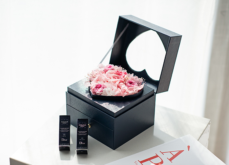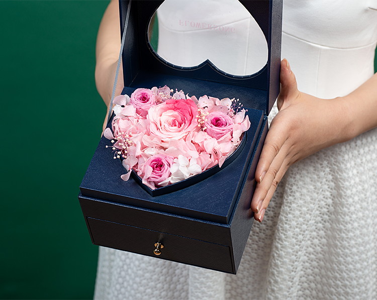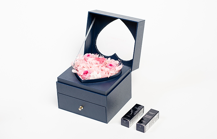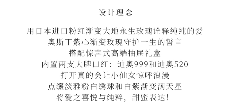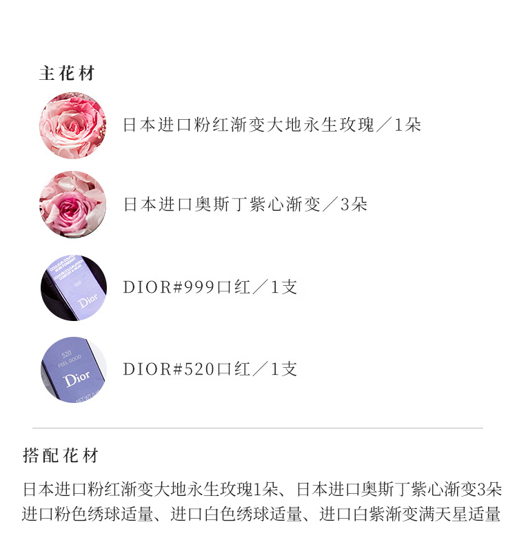 立减8元日本进口粉红渐变大地永生玫瑰1朵(直径7-8厘米),日本进口奥斯丁紫心渐变(直径2.8-3厘米)3朵,进口粉色绣球适量4.进口白色绣球适量,进口白紫渐变满天星适量;搭配专柜正品畅销经典款迪奥Dior#999丝绒口红一支、迪奥Dior#888口红一支。高档蓝色定制心形永生花礼盒!