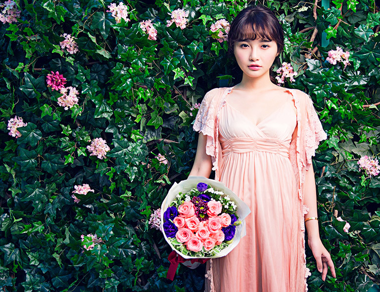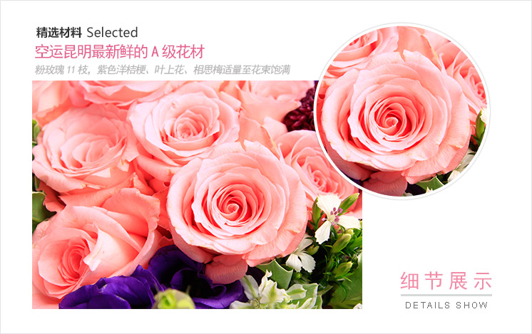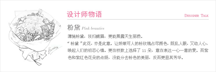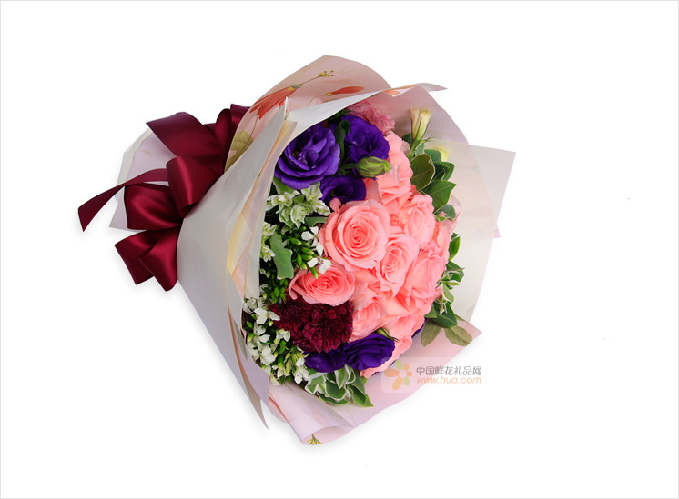 粉玫瑰11枝,紫色洋桔梗、叶上花、相思梅适量至花束饱满