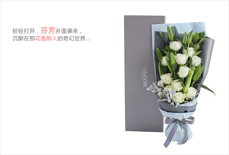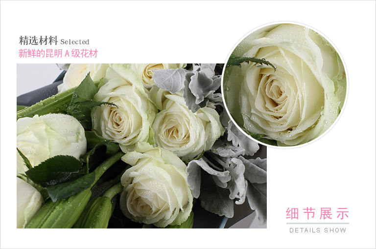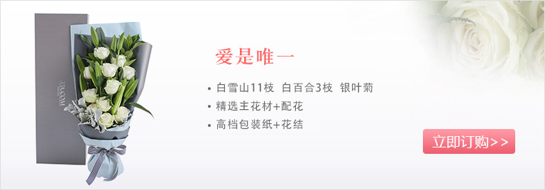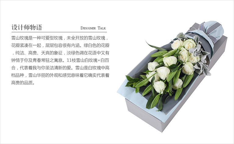 爱上海后花园雪山白玫瑰11枝、多头白百合3枝、银叶菊5枝、栀子叶2枝