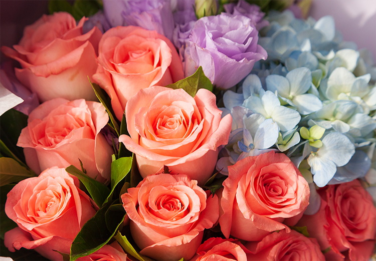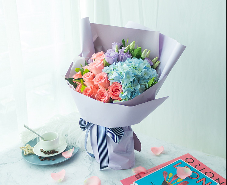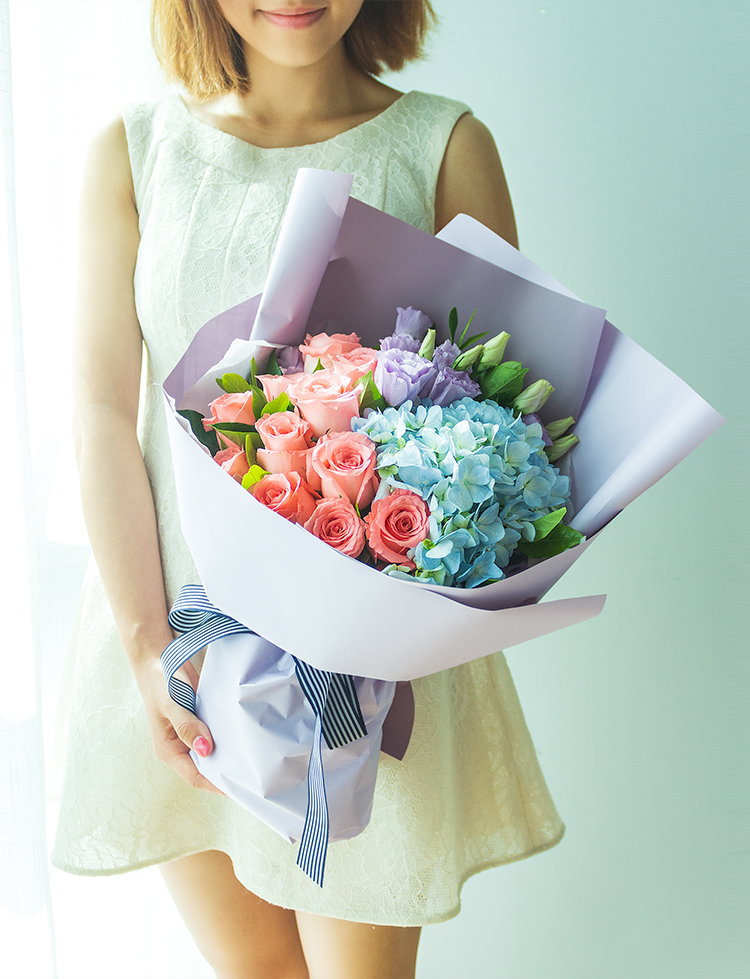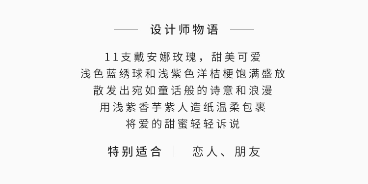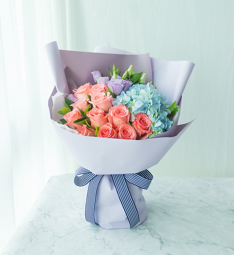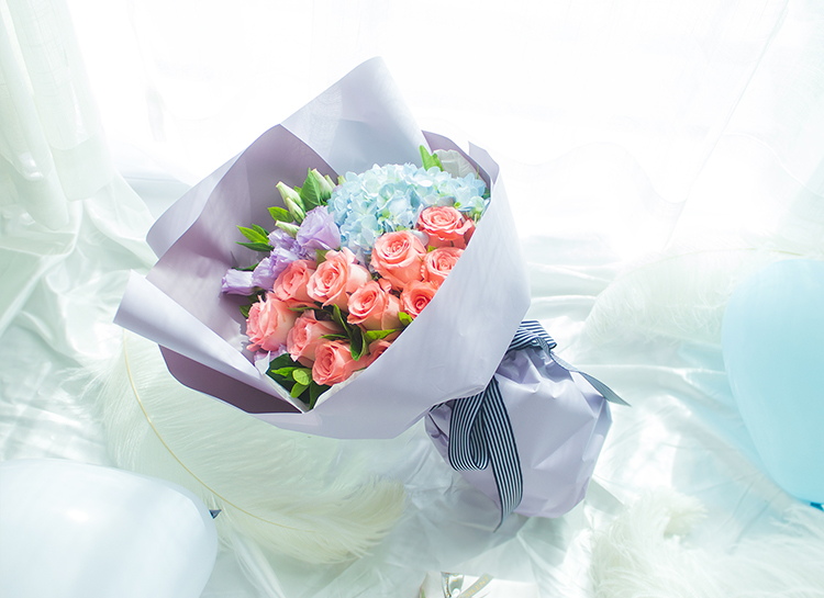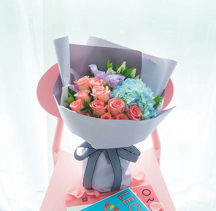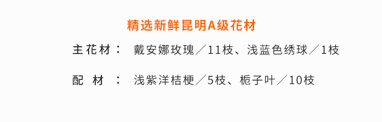 戴安娜粉玫瑰11枝,浅蓝色绣球1枝,浅紫洋桔梗5枝,栀子叶10枝